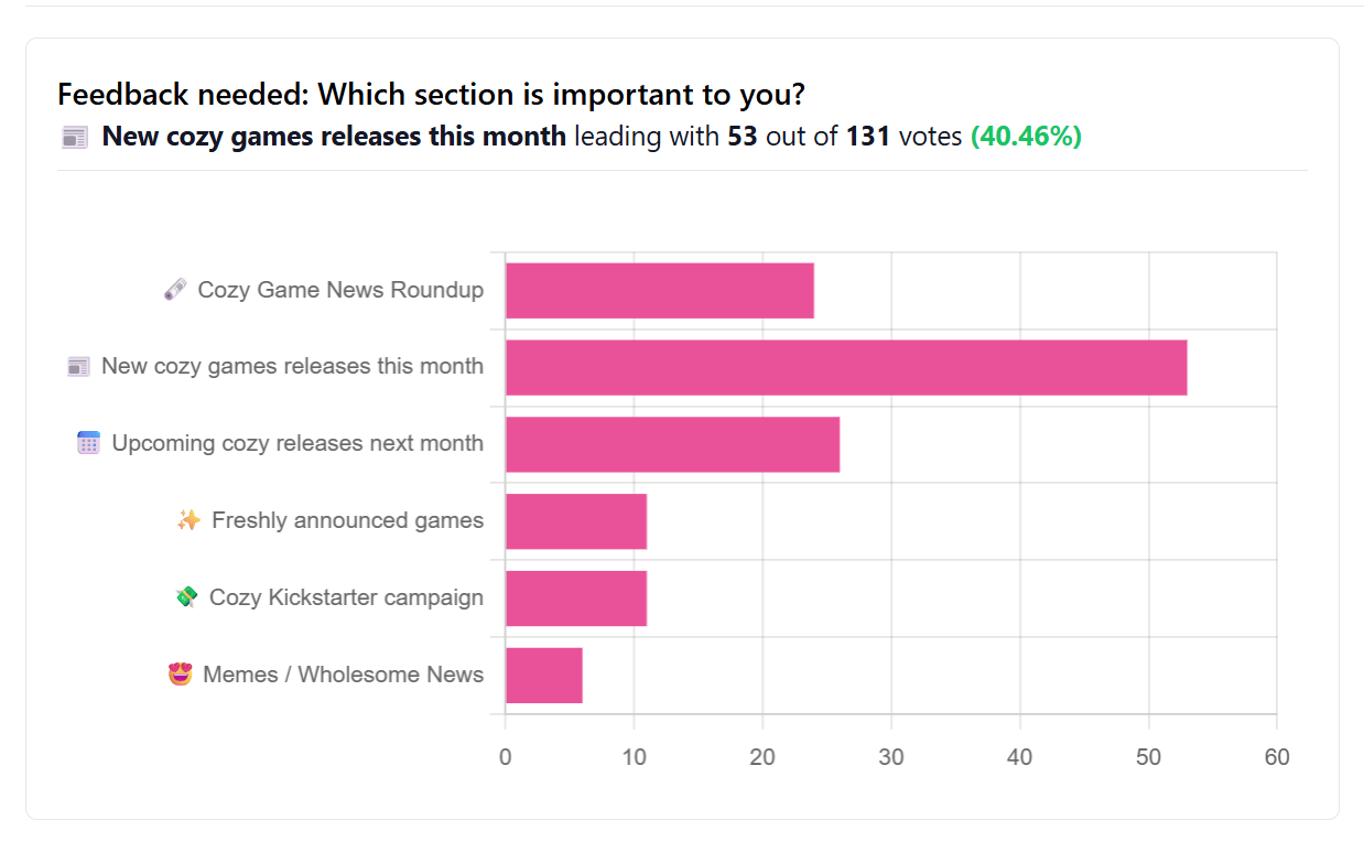 Last week we asked you which category you like best. The winner was "New Cozy Releases this Month", but it seems everyone interpreted it a bit differently 😯. Some thought it meant upcoming releases, others thought it was about games already out. So next Month, we’ll make a clearer poll :P.